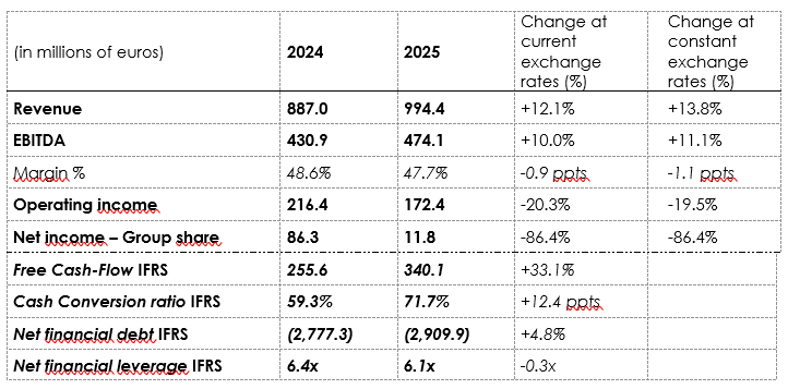 In 2025, the Group generated significant positive Free Cash-Flow of 340 million euros. The Group’s Cash Conversion Ratio (Free Cash-Flow/EBITDA) under IFRS thus stood at 71.7%, thanks to good management of its working capital requirement.